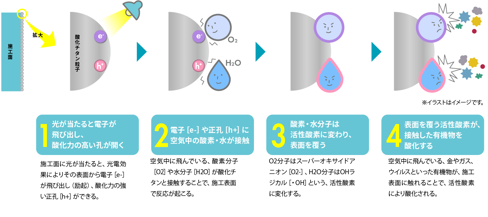 吹きつけるだけで、超微粒子の酸化チタン粒子が定着し、長期間にわたって「吹きつけた面」で酸化反応により