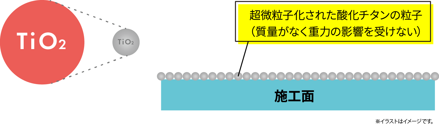 酸化チタン粒子のナノ化に成功したことで、分子間力(電気的な結合)によって自力で施工面に決着します。
