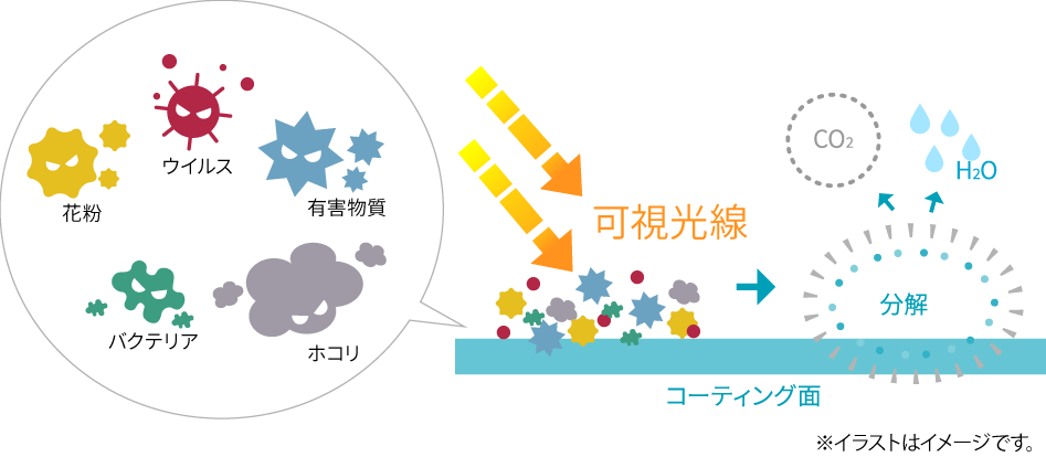 およそ可視光全般で反応が起こるので、従来の光触媒のように紫外線などの強い光は必要なく、室内灯など、実生活の空間で十分に作用が発揮されます。
